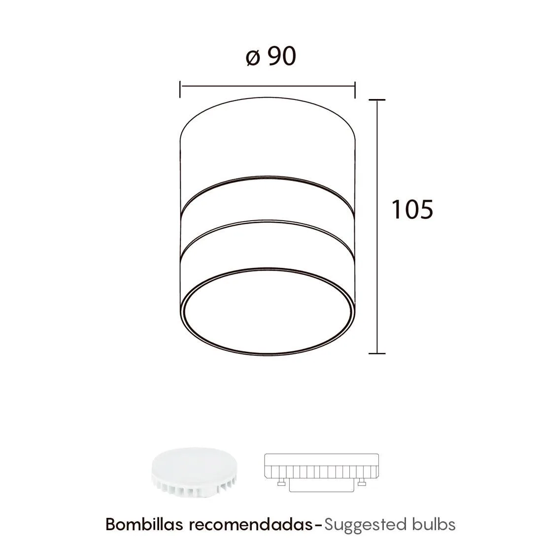 Funciona con bombilla LED GX53 (no incluida), un formato plano que favorece luminancias cómodas y un perfil compacto. Elegir GX53 permite personalizar tono de luz (CCT) y ángulo de apertura según la aplicación: cálido para ambientes acogedores, neutro para uso diario o blanco frío para máxima definición visual.
