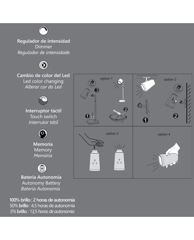 • 3 funciones: linterna, flexo y lámpara de mesilla.