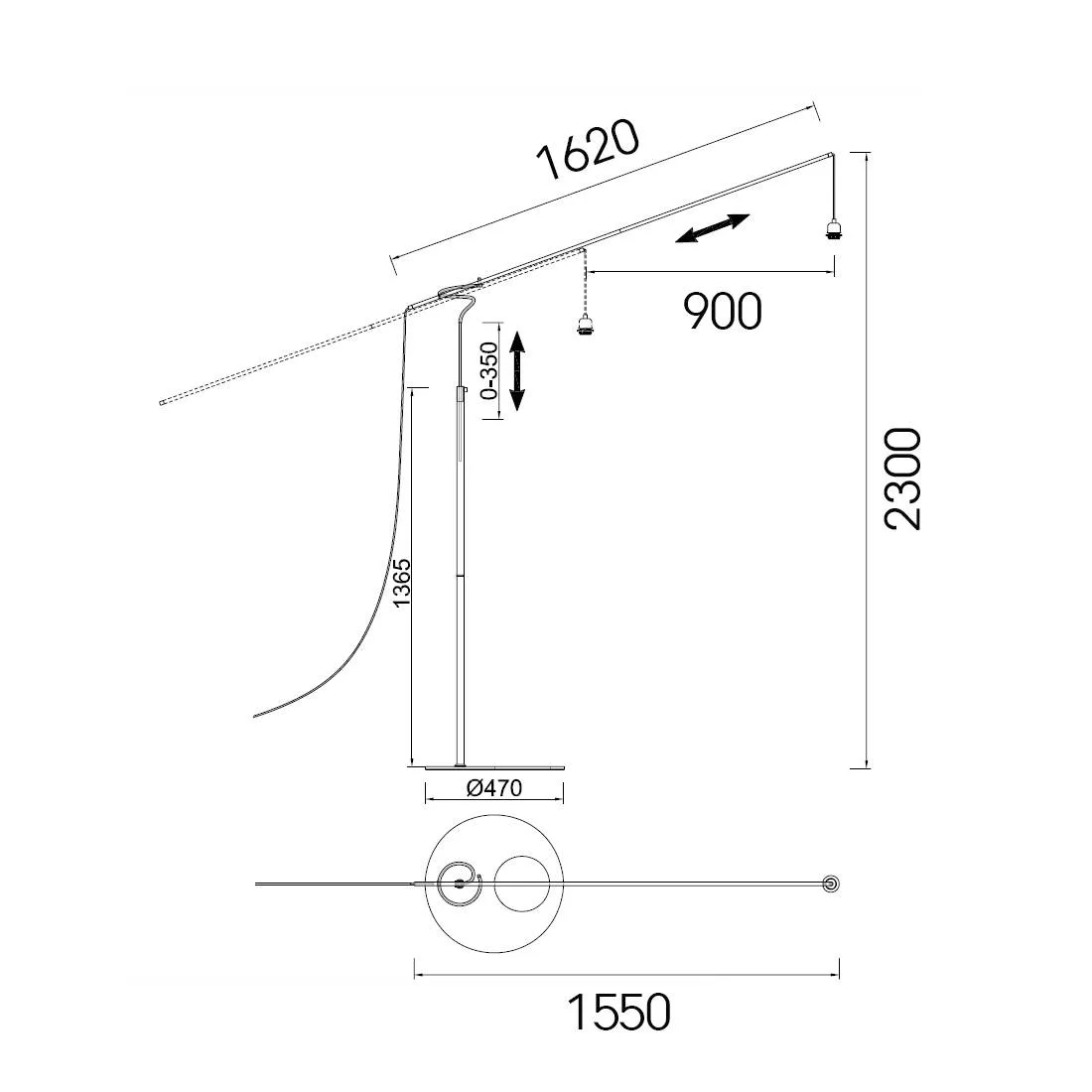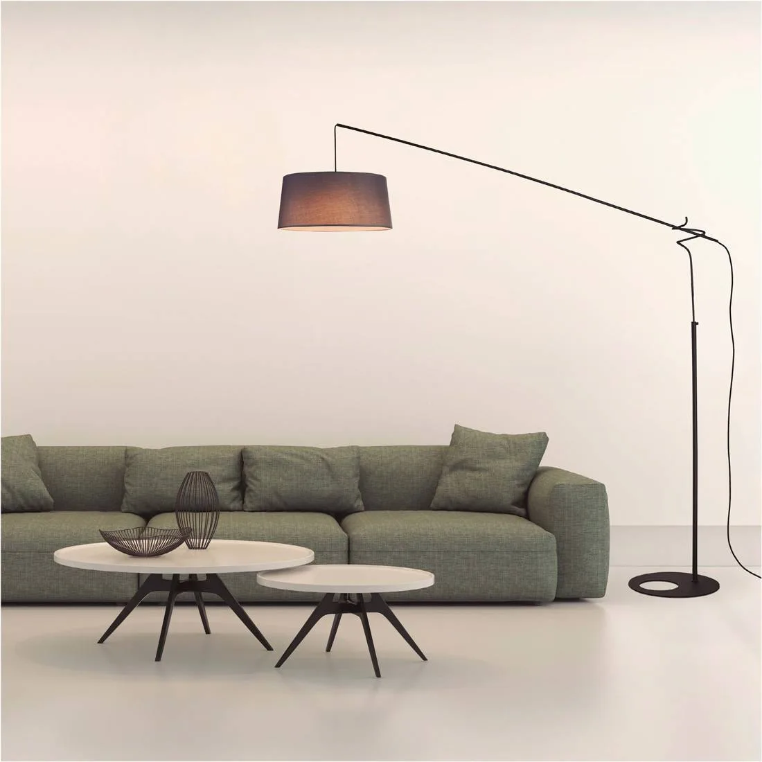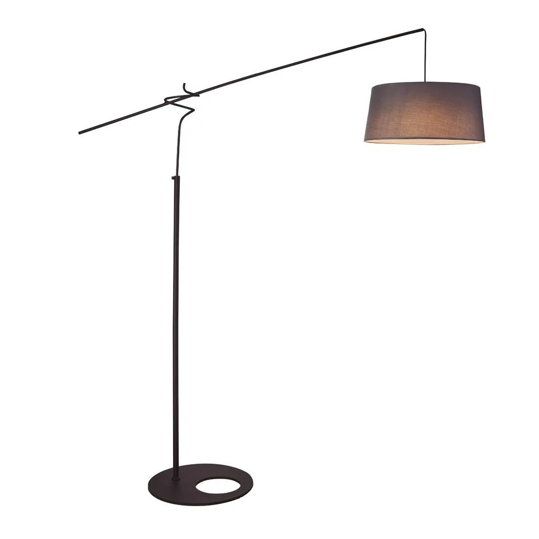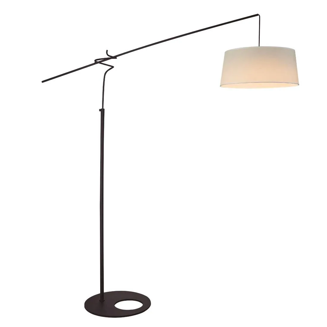 La base es plana y pesada, aportando estabilidad, y se remata con un círculo decorativo que añade un toque moderno y sofisticado. Desde la base asciende una columna metálica delgada en negro mate hasta el punto de articulación del brazo. En el tramo superior, incorpora un mecanismo de deslizamiento del contrapeso que permite ajustar el alcance del brazo con un recorrido de hasta 90 cm, adaptando la posición de la luz a la distribución del salón o a la zona de lectura. Es ideal para aquellas zonas donde se necesite un punto de luz alto sin hacer obras en el techo.
