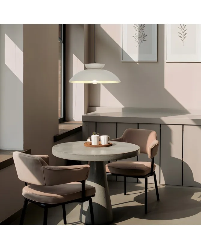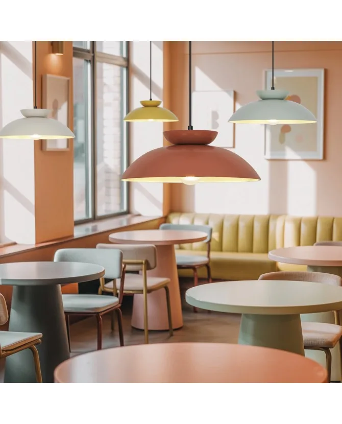 La lámpara colgante IDEA es una pieza retro de líneas limpias y acabado en colores pastel que aporta personalidad y calidez a cocinas, comedores y espacios abiertos. Fabricada íntegramente en aluminio, combina ligereza y durabilidad, con una pantalla de 36 cm de diámetro que proyecta la luz hacia la superficie de trabajo o de la mesa, creando una iluminación cómoda y sin deslumbramientos.